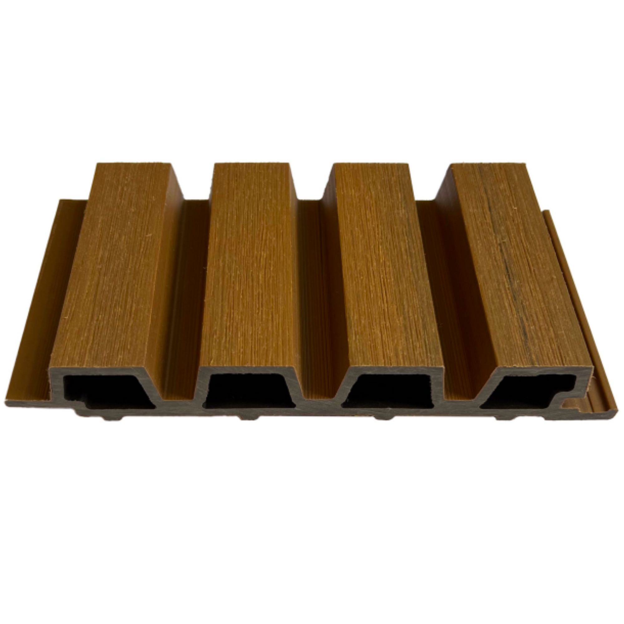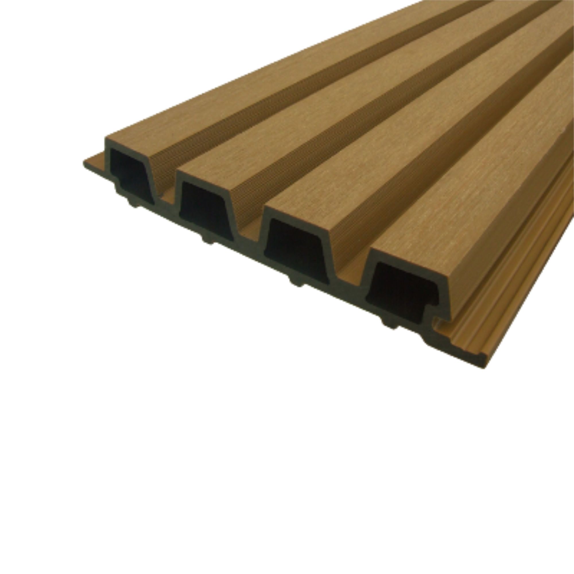 Ez egy koextrudált, 2. generációs WPC panel, amelynél a külső cap layer réteg extra felületvédelmet ad – ezért különösen praktikus teraszok, homlokzati felületek és bejárati zónák burkolására.